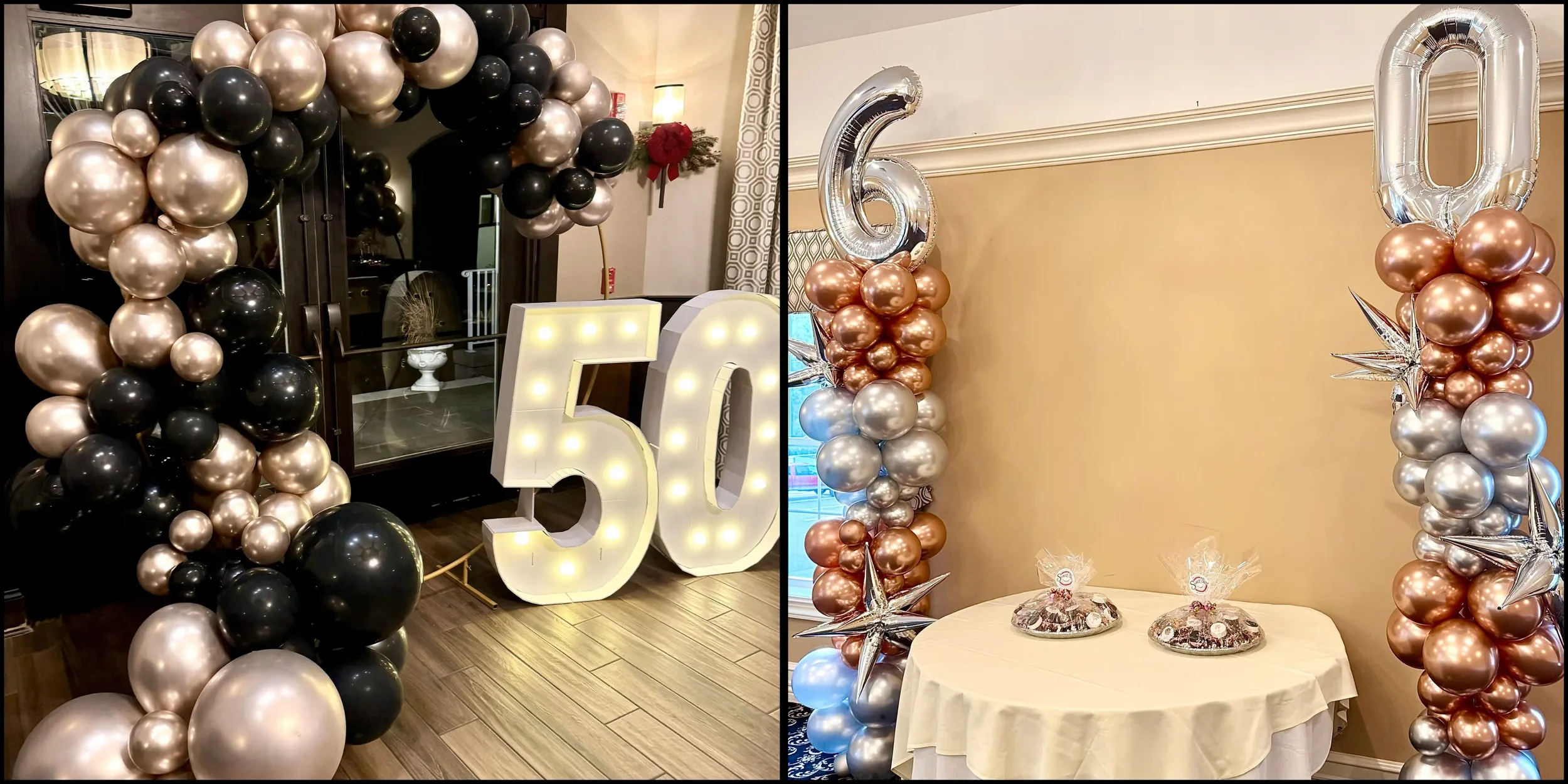 Names, logos, and seasonal messages on oversized balloons for entry and desserts.